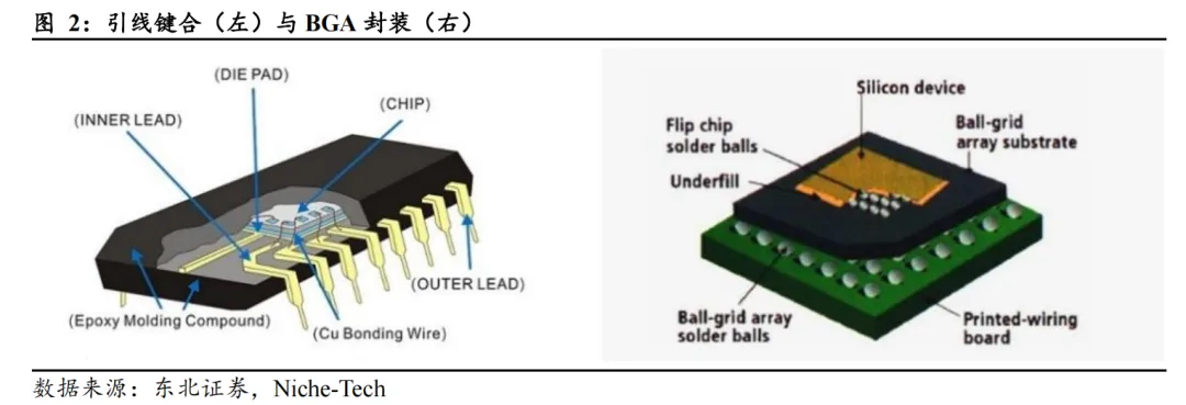 引线键合技术仅支撑百级I/O,已难以满足算力时代对高I/O密度的需求。引线键合主要封装形式包括DIP、PLCC与QFP,通过金丝或铝丝实现芯片与外部引脚连接。封装目标集中于基础电气连通与物理防护,引脚数通常低于100,Pitch 大于100μm,封装体积较大、信号路径较长、散热能力有限。该阶段与微米级制程相匹配,为SMT与规模化制造奠定产业基础,但在I/O密度与性能层面存在天花板。