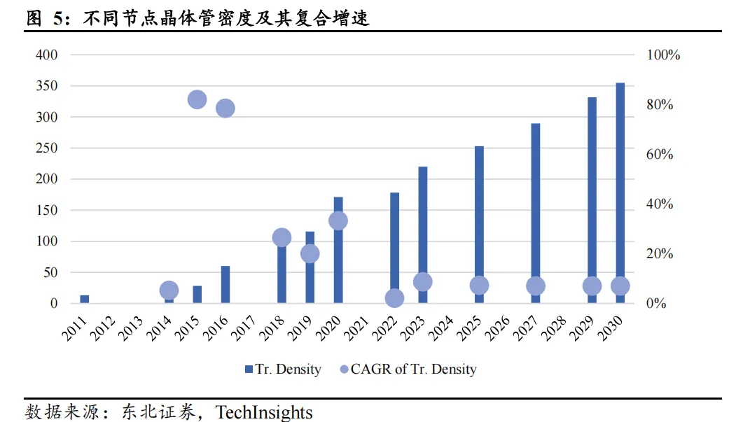 摩尔定律放缓叠加光罩面积约束限制单芯粒性能,Chiplet 解放单芯片性能上限。一方面,摩尔定律逐步失效,晶体管密度提升节奏已从“两年翻倍”显著放缓,2011年28nm 制程的晶体管密度可达13.31百万个/mm2,2020 年的5nm 制程的晶体管密度为171.3百万个/mm2,对应晶体管密度的复合增速为30%+。然而,5nm 以下制程,其晶体管密度增速便开始显著放缓,摩尔定律逐步失效。另一方面,光罩面积上限将单芯粒面积限制在858mm2以下,高NAEUV方案下更会减半至约429mm2。面积与单位面积晶体管数量均受限,单芯粒性能难以提升。Chiplet 技术通过将多颗芯粒有机拼装为一颗芯片,解放单芯片性能上限。