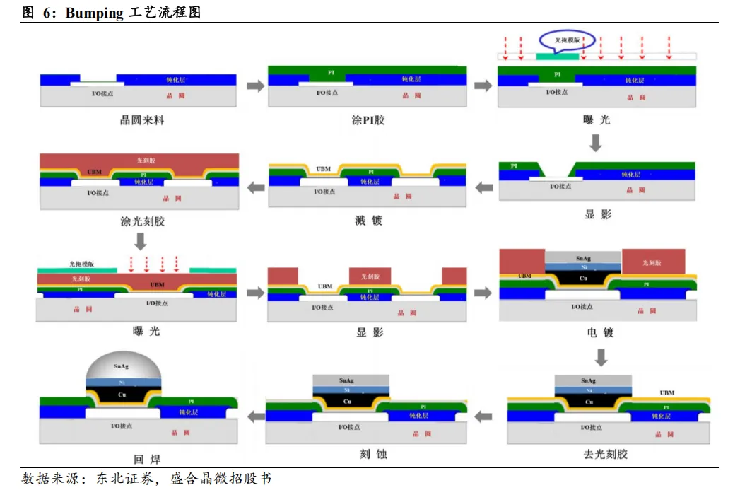 Bumping 工艺是先进封装的基石,取代引线键合实现高密度电气互联。凸块是一种微型金属球或柱形连接物,用于实现芯片与基板等的短距离、高密度的电气互联和信号传输。Bumping 指通过溅镀、光刻、电镀、刻蚀等工序,在晶圆表面制造凸块。相比引线焊接,Bumping 工艺可以缩短连接电路的长度、降低信号传输的延迟、减小芯片的封装体积,同时允许芯片有更高的I/O密度、更优良的热传导性及可靠性。