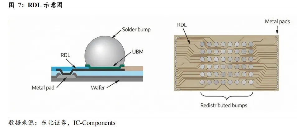 RDL技术突破芯片边沿限制,支撑晶圆级封装实现。RDL指通过溅镀、光刻、电镀、刻蚀等工序,在晶圆表面制造金属布线,将原本分布在芯片边沿的I/O接点优化和调整到更为宽松的区域。RDL 通常由金属层、介电层和垫层组成,其中金属层用于实现电路连接,介电层用于隔离和绝缘信号线,垫层用于平衡高度差和减小封装压力。此工艺既可支持更多的I/O 接点,又可实现水平平面的电气延伸和互联。
