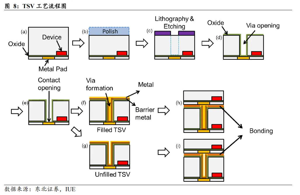 TSV 技术破解垂直互联难题,是2.5D/3D 集成的关键基础设施。TSV 指通过深孔刻蚀、薄膜沉积、铜填充、化学机械抛光等工序,在晶圆内部形成一系列垂直通孔,实现晶圆内部的垂直互联和信号传输。相比水平互联,TSV可以减小互联长度和信号延迟,降低寄生电容和电感,实现芯片间的低功耗和高速率通信,主要应用于2.5D/3DIC 等先进封装技术中。