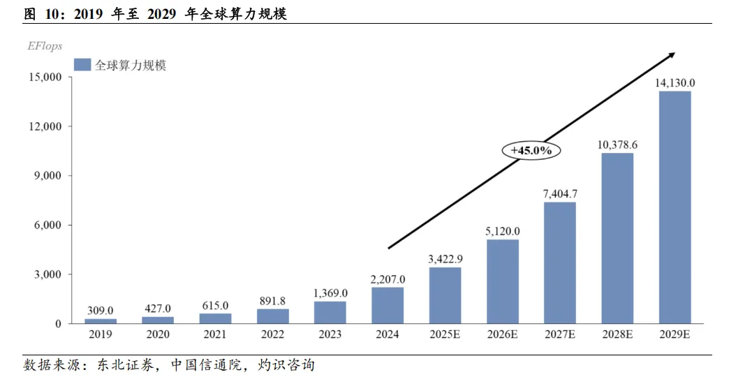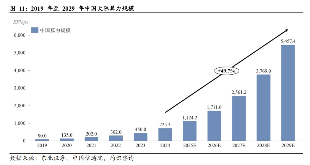 根据英伟达统计,大模型出现前算力需求每两年增长约8 倍,大模型出现后这一增速大幅提升至每两年约275 倍;OpenAI预计GPT-5所需计算资源将较GPT-3高出200 至400倍。全球算力规模从2019年的309.0EFlops增长至2024年的2,207.0EFlops,复合增长率为48.2%;预计2029年将达到14,130.0EFlops,2024年至2029年复合增长率为45.0%。中国大陆算力规模从2019 年的90.0EFlops增长至2024 年的725.3EFlops,复合增长率为51.8%;预计2029年将达到5,457.4EFlops,2024年至2029 年复合增长率为49.7%。
