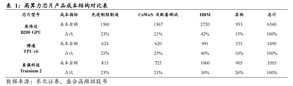 主流AI芯片数据交叉验证,芯片层面先进封测价值量已与先进制程持平。根据盛合晶微招股书披露的高算力芯片成本结构数据,以三款主流AI芯片为例:1)英伟达B200GPU 的先进制程芯片制造环节成本为1,500美元/颗(占总成本23%),CoWoS 及配套测试环节成本为1,367美元/颗(占总成本21%),两者价值量接近,先进封装及测试成本达到先进制程芯片制造成本的91%;2)博通TPUv6的先进制程芯片制造环节成本为624美元/颗(占总成本25%),CoWoS 及配套测试环节成本为620美元/颗(占总成本25%),价值量几乎持平,两者差距仅0.6%;3)美满科技Trainium2的先进制程芯片制造环节成本为815美元/颗(占总成本23%),CoWoS及配套测试环节成本为725美元/颗(占总成本21%),两者差距仅约11%。