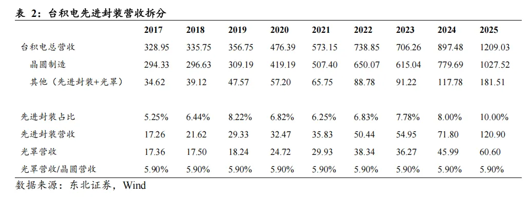 第一步:根据台积电官方电话会披露信息测算2024-2025 年先进封装营收。根据台积电电话会议释放的信息,2024年和2025年先进封装占总营收的比例大约为8.00%和10.00%。结合这两年的总营收(2024 年897.48 亿美元、2025 年1,209.03 亿美元),可直接计算出2024 年先进封装营收为71.80亿美元(897.48×8%),2025 年先进封装营收为120.90 亿美元(1,209.03×10%)。