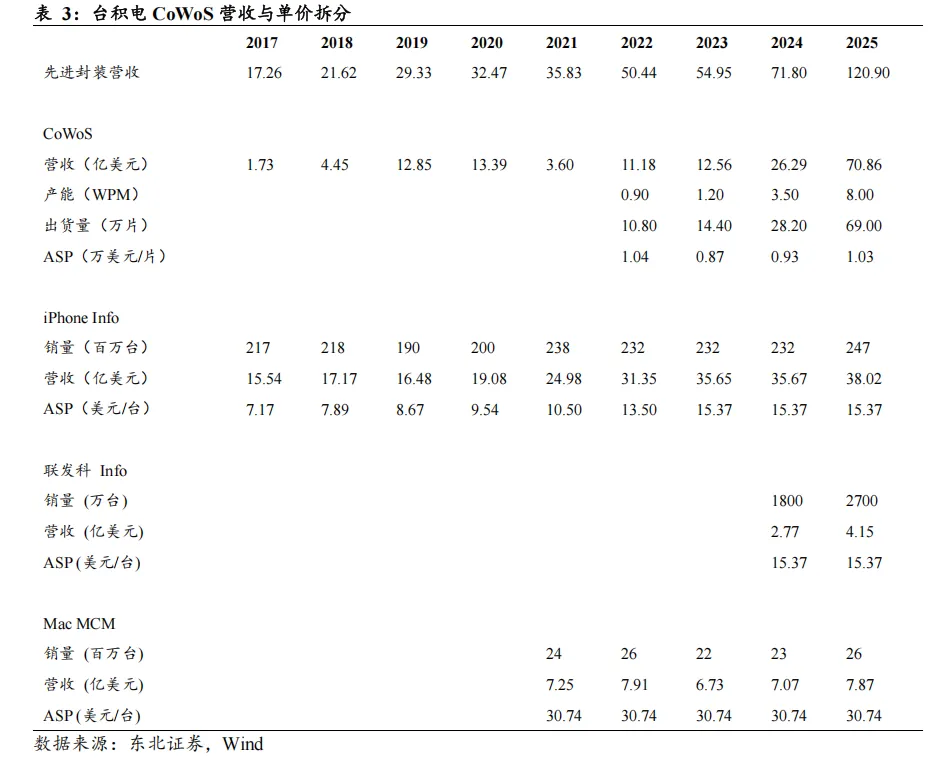 路径二立足宏观财务拆解(自上而下):以台积电的历史及预测营收数据为基座,按照“总营收 → 先进封装总营收 →剥离消费电子封装→纯CoWoS营收及ASP”的漏斗模型,层层剥离倒算实际财务均价。