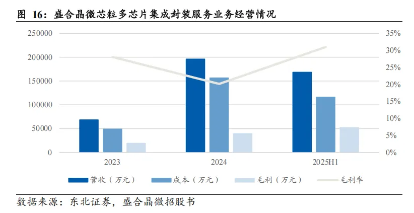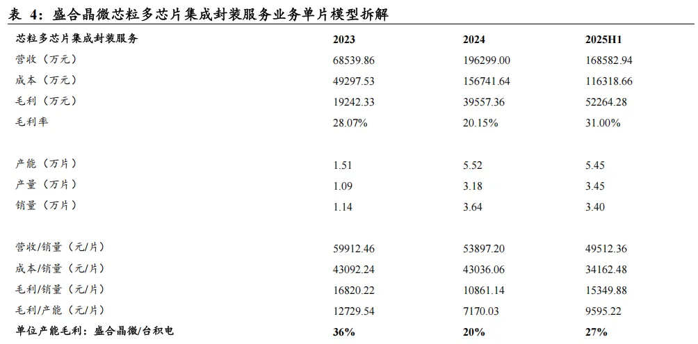 盛合晶微芯粒封装服务业务高速增长,但毛利率远低于台积电水平。根据招股说明书披露数据,2023-2025H1该业务营收分别为6.85亿元、19.63亿元、16.86亿元,2024 年同比增幅达186%;对应毛利率分别为28.07%、20.15%、31.00%,2024 年毛利率下滑主要系产能爬坡期固定成本摊薄不足,2025H1随产能利用率提升已回升至31%。从毛利额来看,2023-2025H1分别为1.92 亿元、3.96 亿元、5.23 亿元,盈利规模快速扩张。