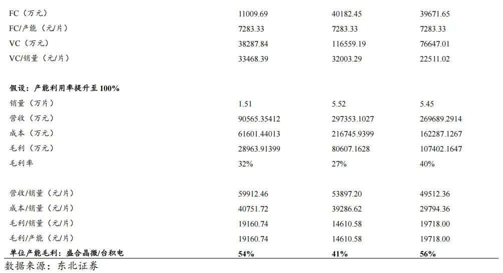 通过拆分固定成本与可变成本,量化产能打满后固定成本摊薄效应。要准确评估盛合晶微长期稳态下的盈利能力,需将成本结构拆分为FC与VC两部分。FC 主要来源于设备与厂房折旧,与产能规模相关但短期内不随产量变化;VC 主要源于原材料、人工等,与销量直接挂钩。通过拆分FC与VC,可以计算产能打满情景下固定成本摊薄效应对毛利率的改善幅度。