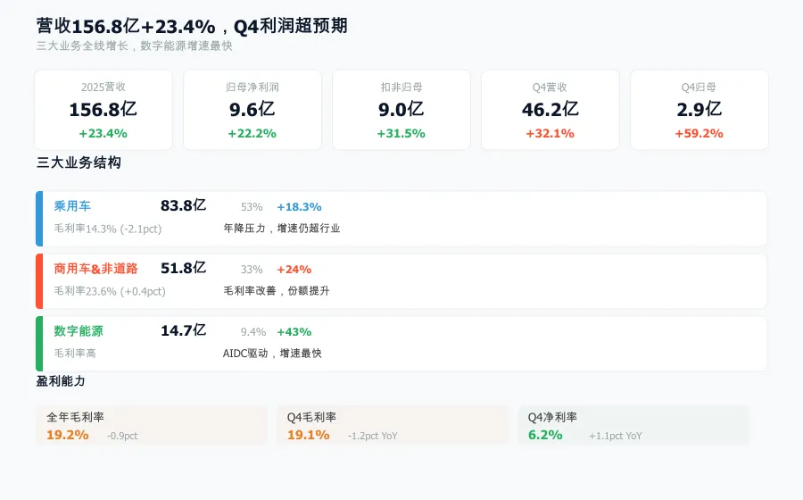先看整体:2025年营收156.8亿(+23.4%),归母9.6亿(+22.2%),扣非9.0亿(+31.5%)。三大业务板块全部增长,而且增速都明显超过行业水平。