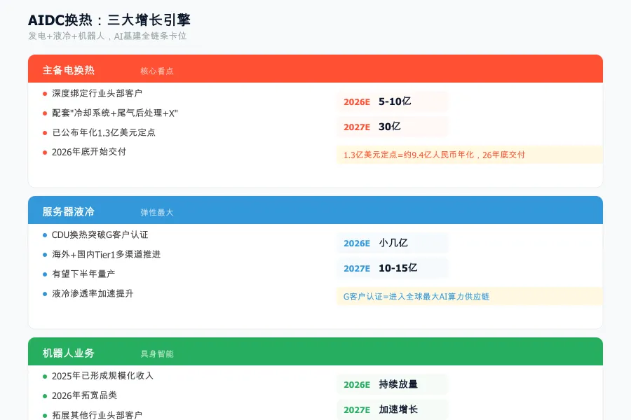 确定性二:AIDC定点密集落地 1.3亿美元年化定点+G客户CDU认证,不是PPT,是真实订单。2026年AIDC贡献5-10亿,2027年40-45亿,增速极快。