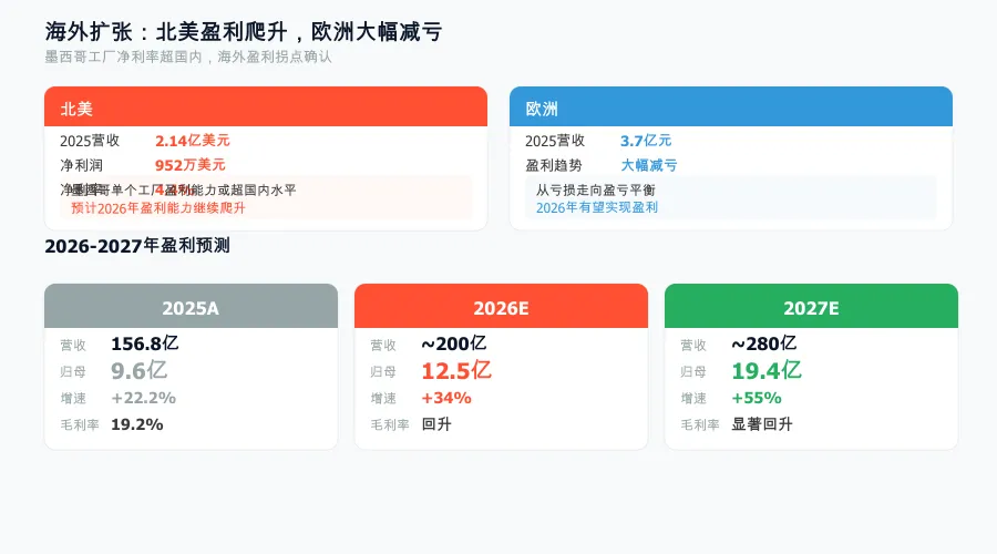 北美2025年营收2.14亿美元,净利润952万美元,净利率4.4%。这个数字看起来不高,但要注意——这只是墨西哥工厂的起步阶段,单个工厂的盈利能力已经可能超过国内水平。随着产能爬升和规模效应,2026年北美盈利能力还会继续提升。