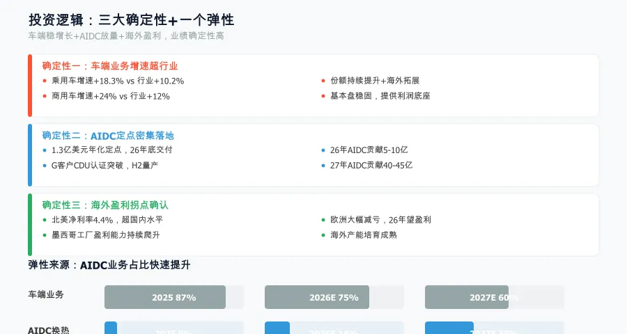 弹性来源:AIDC业务占比快速提升 2025年数字能源只占9.4%,预计2026年升至18%,2027年达到35%。这意味着公司的估值锚从"汽车零部件"转向"AI基础设施",估值中枢有上移空间