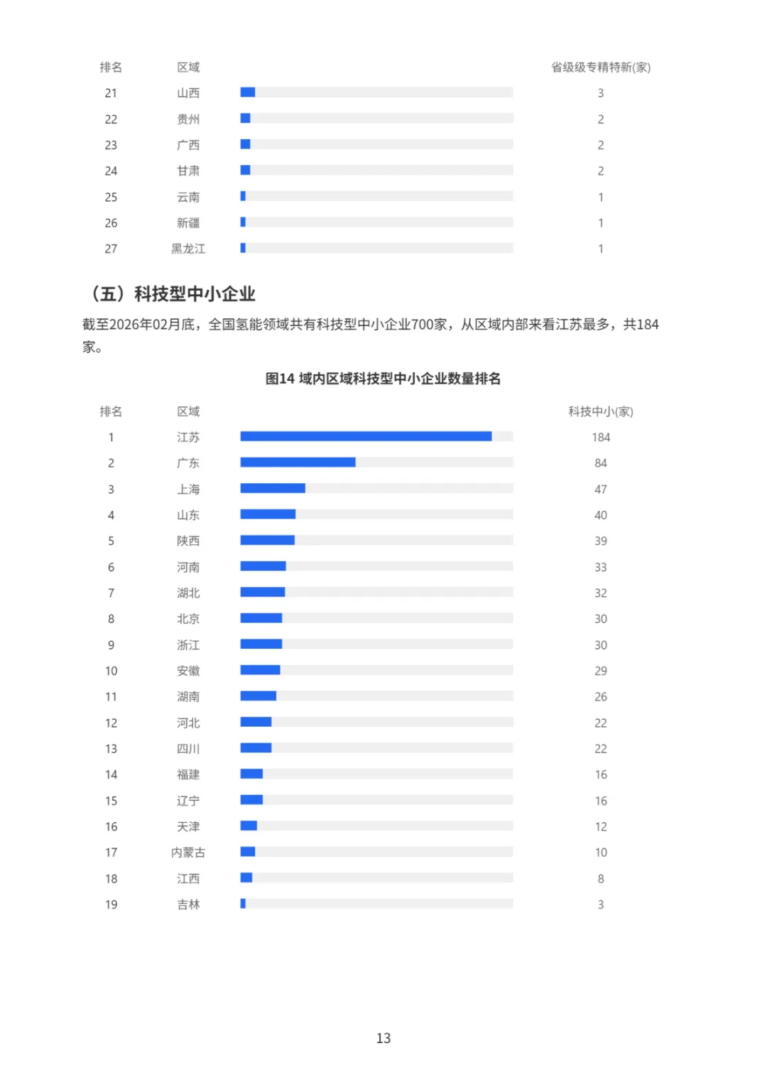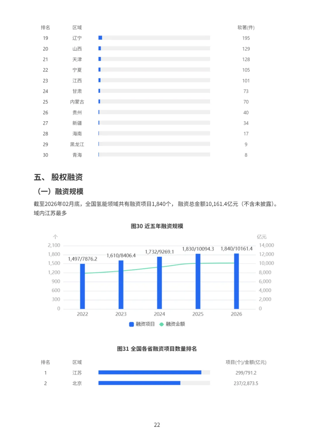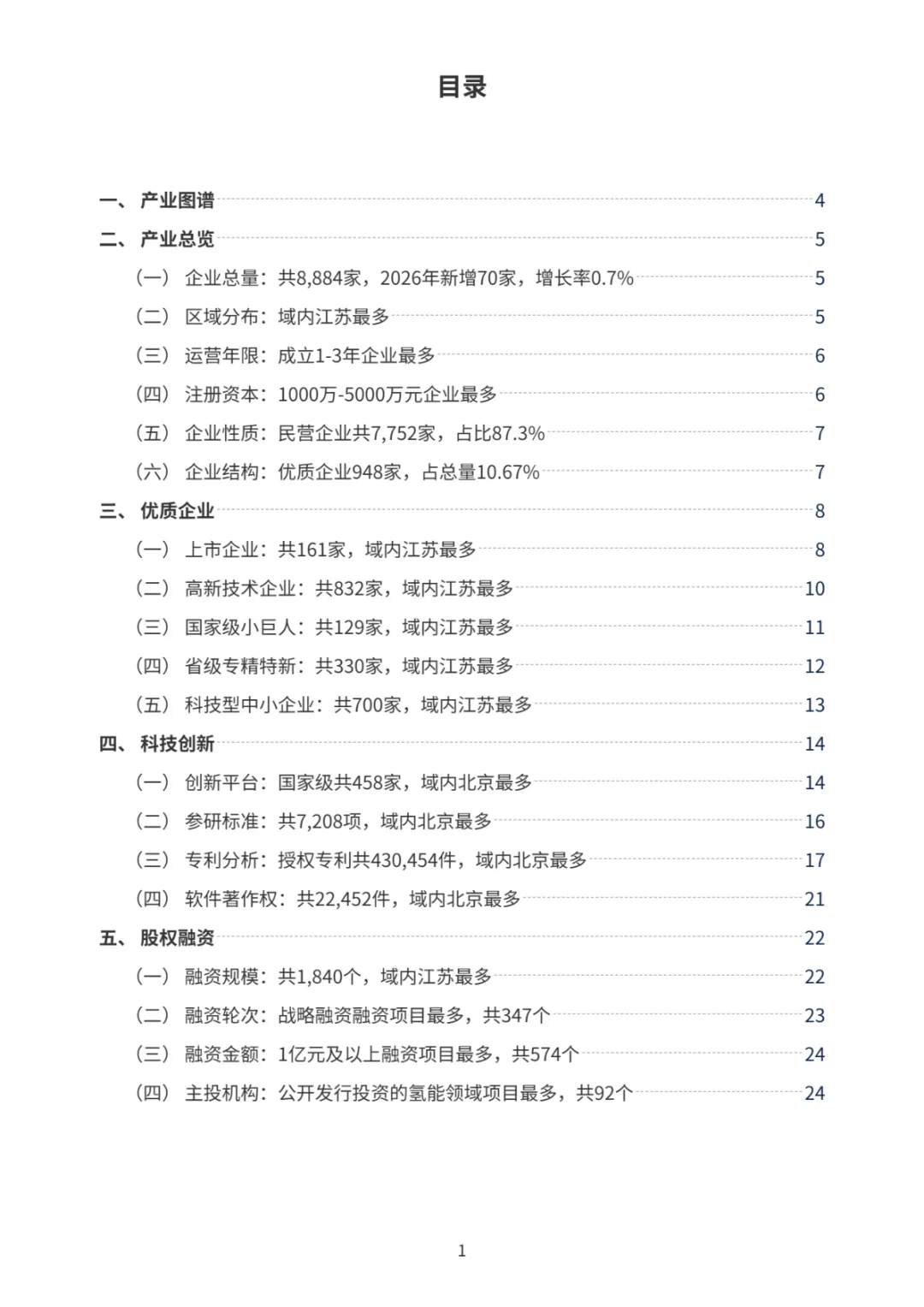 2026 年氢能产业研究报告全面呈现国内氢能行业发展格局。报告围绕产业图谱、企业概况、优质主体、科技创新、股权融资五大维度展开分析。氢能产业链覆盖原材料、生产供应、装备零部件及应用四大核心板块,细分二十九个具体环节,应用场景延伸至交通、工业、发电等多个领域。国内氢能相关企业总量达八千八百八十四家,民营企业占比超八成。江苏在企业总量、优质企业数量等多项指标中位居前列。企业运营年限集中在一至三年,注册资本以一千至五千万元区间为主。优质企业包含上市企业、高新技术企业、专精特新企业等类型,形成多层次优质主体结构。产业创新成果丰富,北京在创新平台、参研标准、专利及软件著作权方面保持领先。全国授权专利总量突破四十三万件,创新支撑能力持续增强。股权融资市场活跃度较高,累计融资项目一千八百四十个,融资金额超万亿元。江苏融资项目数量领先,北京融资总额突出。战略融资为主要融资轮次,亿元以上规模项目占比较高,资本对氢能产业的投入保持稳定态势。