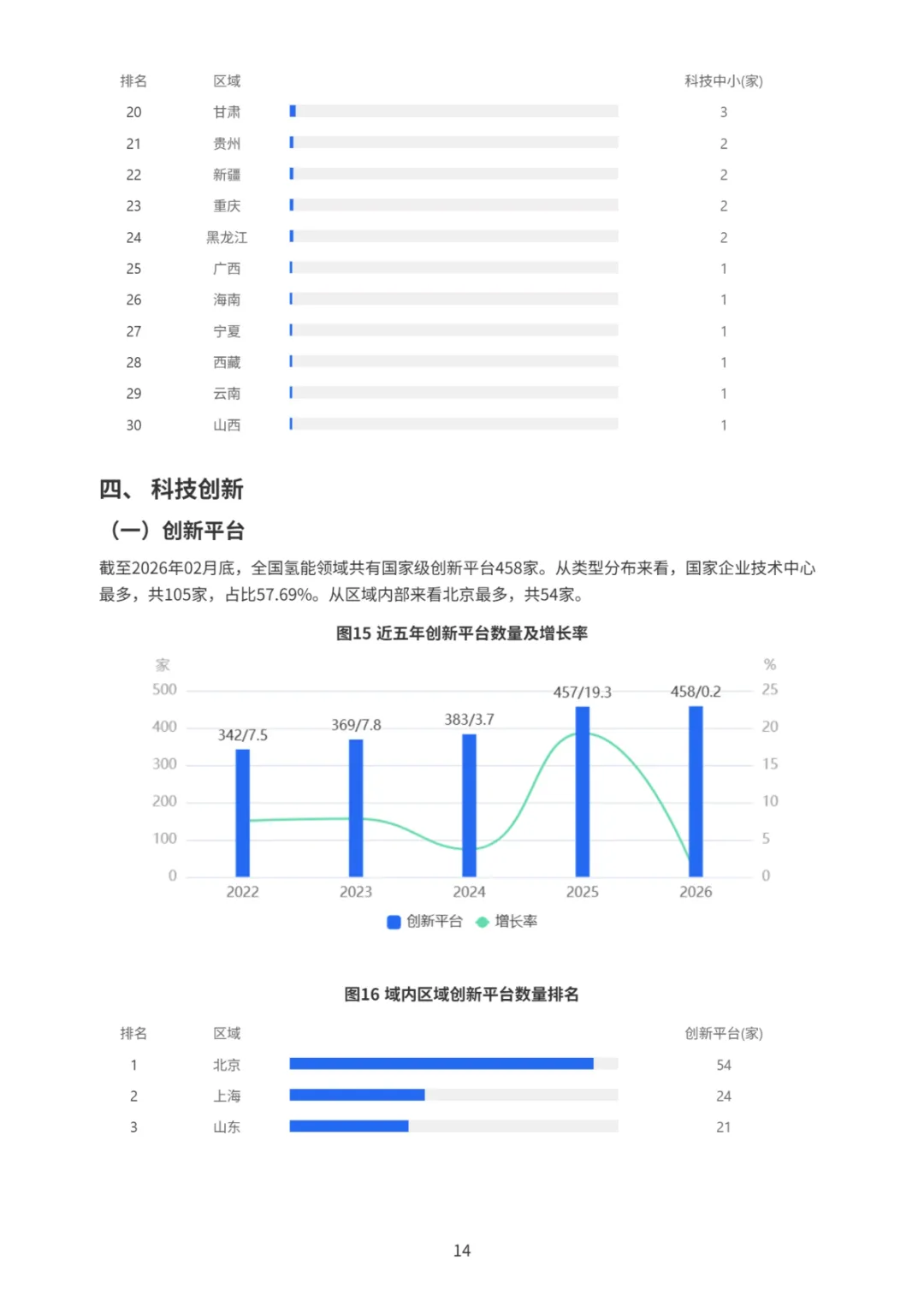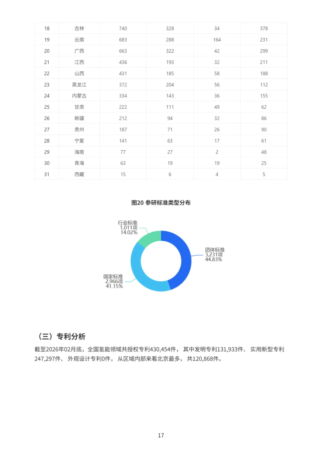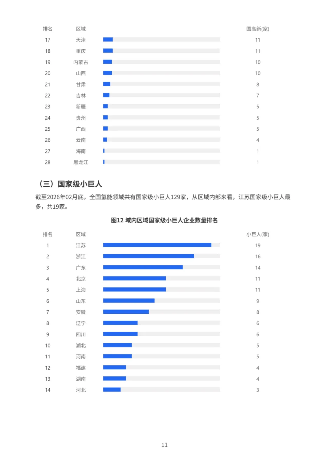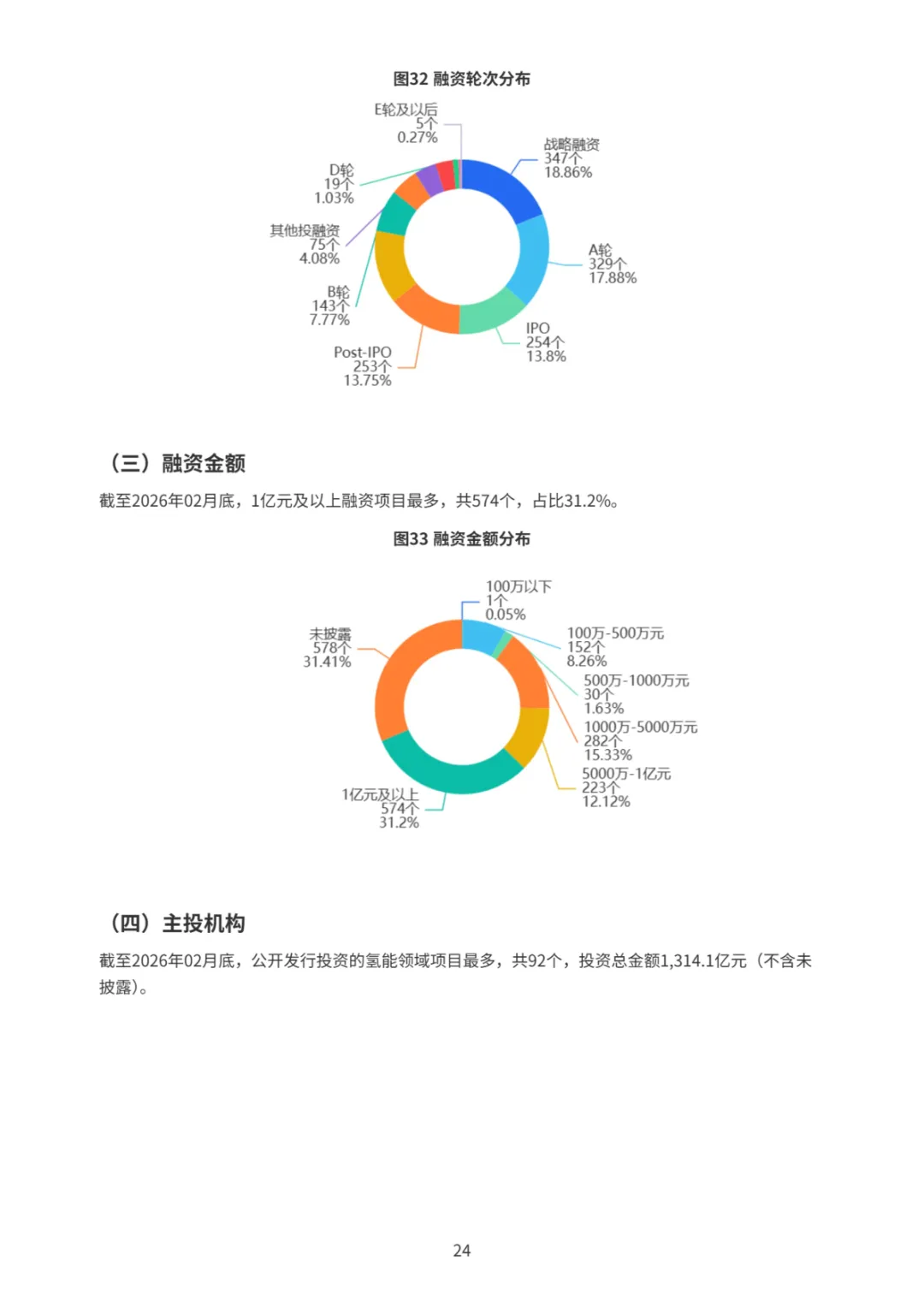 2026 年氢能产业研究报告全面呈现国内氢能行业发展格局。报告围绕产业图谱、企业概况、优质主体、科技创新、股权融资五大维度展开分析。氢能产业链覆盖原材料、生产供应、装备零部件及应用四大核心板块,细分二十九个具体环节,应用场景延伸至交通、工业、发电等多个领域。国内氢能相关企业总量达八千八百八十四家,民营企业占比超八成。江苏在企业总量、优质企业数量等多项指标中位居前列。企业运营年限集中在一至三年,注册资本以一千至五千万元区间为主。优质企业包含上市企业、高新技术企业、专精特新企业等类型,形成多层次优质主体结构。产业创新成果丰富,北京在创新平台、参研标准、专利及软件著作权方面保持领先。全国授权专利总量突破四十三万件,创新支撑能力持续增强。股权融资市场活跃度较高,累计融资项目一千八百四十个,融资金额超万亿元。江苏融资项目数量领先,北京融资总额突出。战略融资为主要融资轮次,亿元以上规模项目占比较高,资本对氢能产业的投入保持稳定态势。
