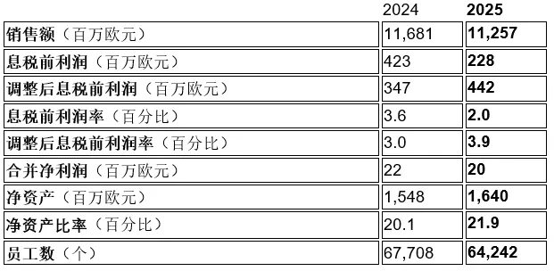 欧洲及北美核心市场客户需求走弱、整车产量下滑,制约集团营收扩张。美国商用车业务表现低迷及欧洲电气化进程未达预期是其中主要原因。各类贸易货币对欧元贬值成为影响营收的最主要因素。此外,对部分合资企业股份及产品业务板块的出售引发合并范围变动,进一步拉低了营收规模。
