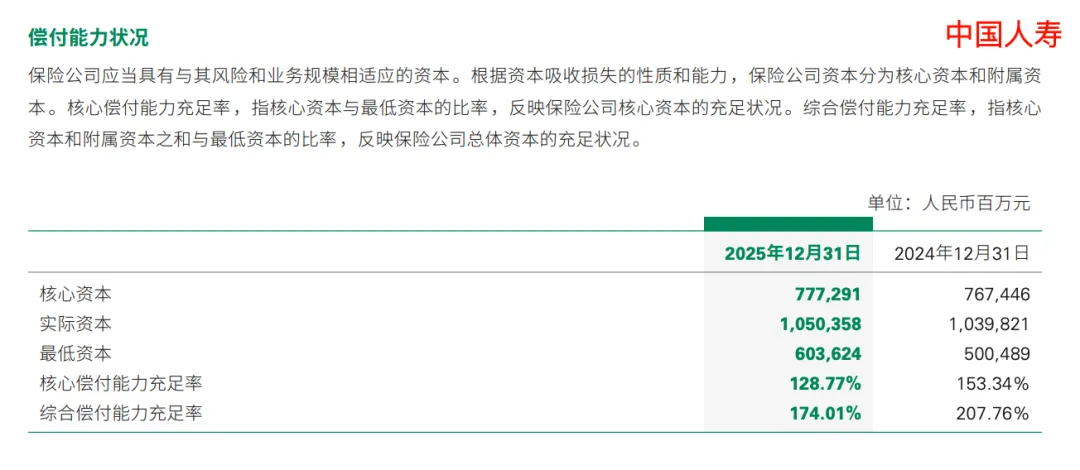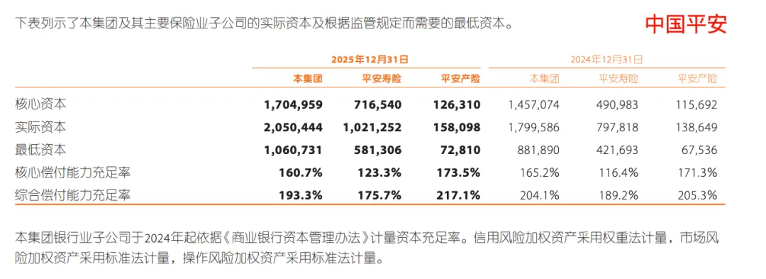 由于这两项是监管的核心指标,保险公司在财报中通常会予以重点披露。下图就是中国平安和中国人寿在财报中对于偿付能力充足率相关的报表。