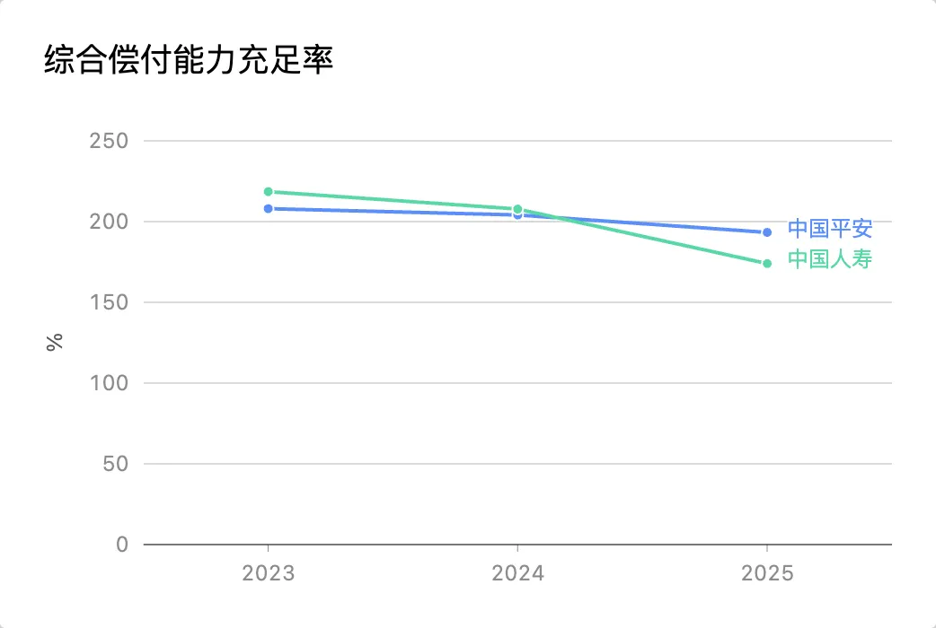 近三年,两家公司的偿付能力充足率均呈现整体下降的趋势,中国平安从208.0%稳步下降至193.3%,累计下降约15个百分点,降幅相对平缓、可控,而中国人寿从218.54%显著下降至174.01%,累计下降超过44个百分点,降幅较大,尤其在2024至2025年间加速下滑。但是,也不用太过担心,两家公司的偿付能力充足率均远高于中国监管的最低要求(核心≥50%,综合≥100%),依然处于行业领先,表明其资本极为充裕,财务稳健性极强,发生偿付风险的可能性极低。