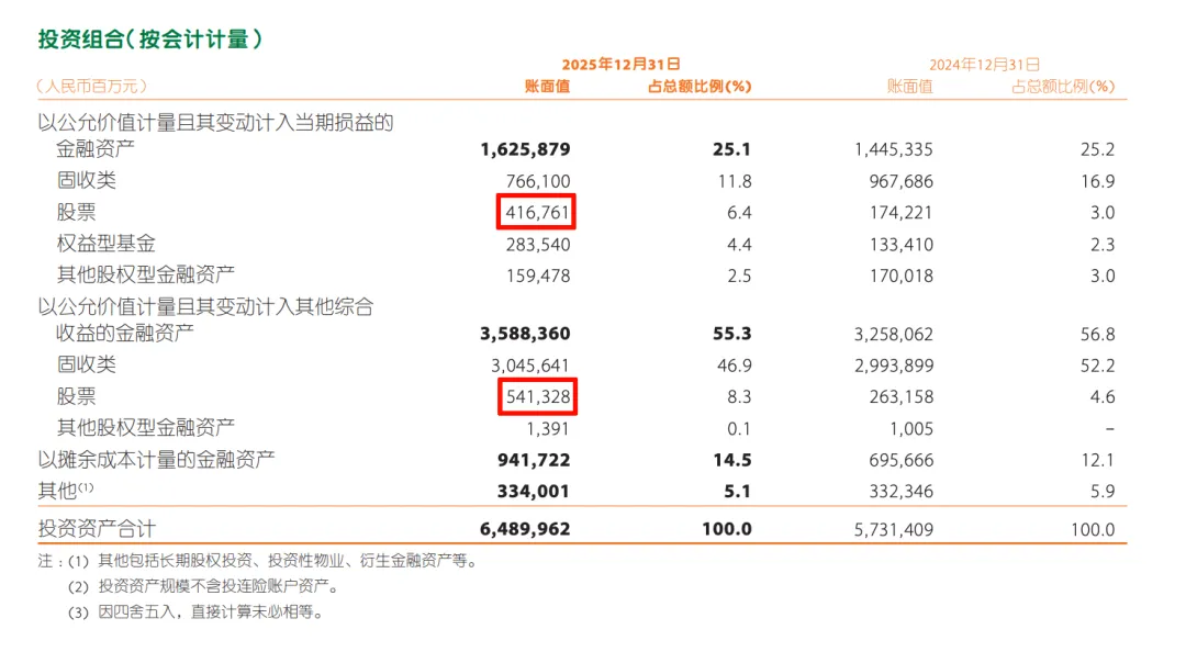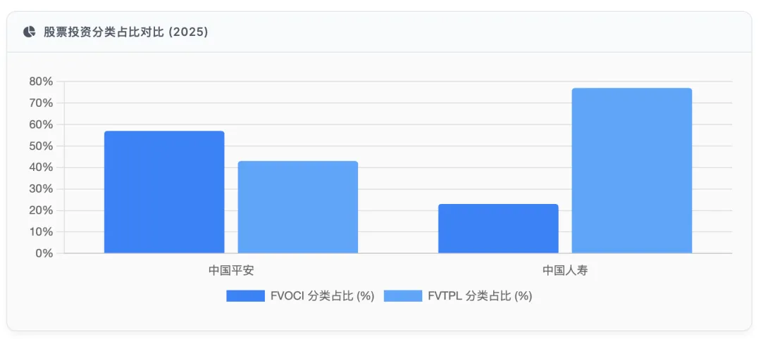 再看看中国人寿,股票投资中 72.2% 分类为FVTPL,约 6028.95 亿元,公允价值变动直接计入当期损益,这导致中国人寿对资本市场波动更为敏感。FVOCI股票账面价值约为 2324.47 亿元。