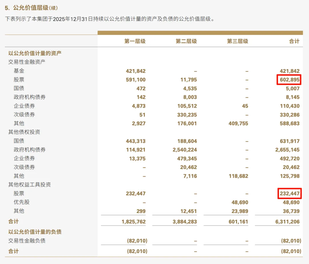 先看中国平安,股票投资中 57% 分类为FVOCI,约 5413.28 亿元,这部分资产的公允价值波动不直接影响当期利润,但股息收入计入利润表。而FVOCI股票账面价值约为 4167.61 亿元,有效平滑了利润波动。