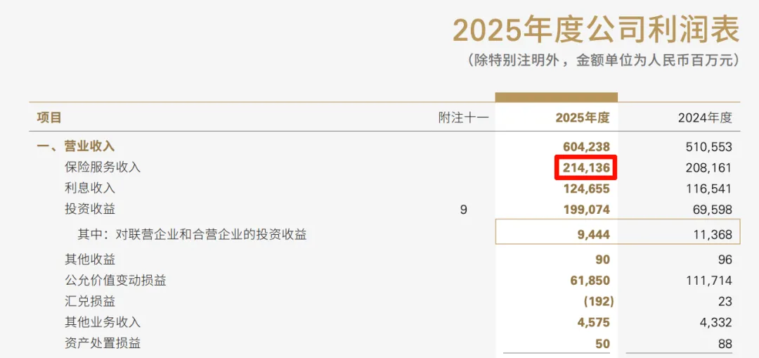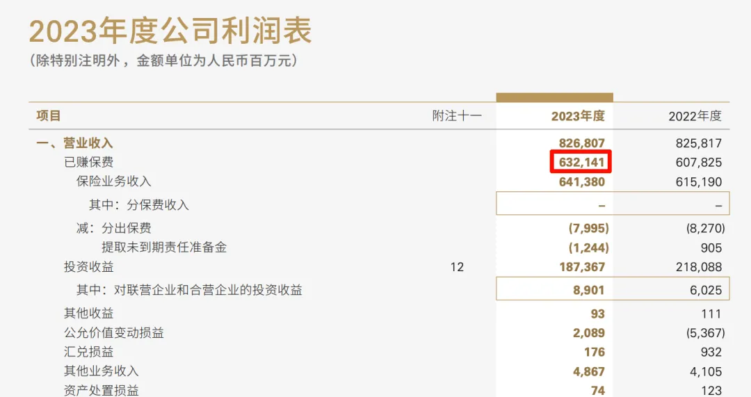 可以看到公司在 2023 年营业收入中,已赚保费 为 6321.14 亿元,2025年的财报中已调整为保险服务收入:2141.36 亿元,二者相差两千多亿元,对营收数据的影响非常显著。。