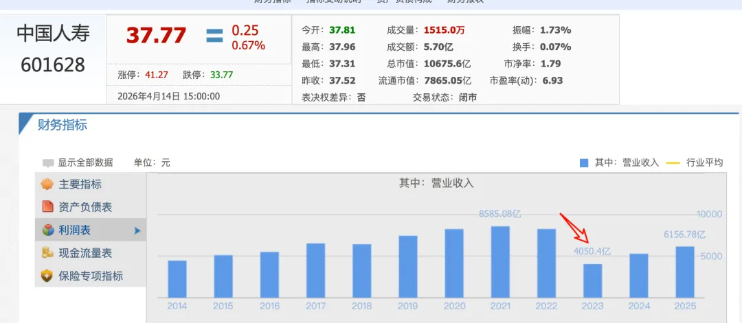 可以看到中国人寿的营收在 2023 年骤降,这不是公司运营出了什么问题,完全是会计准则的调整。