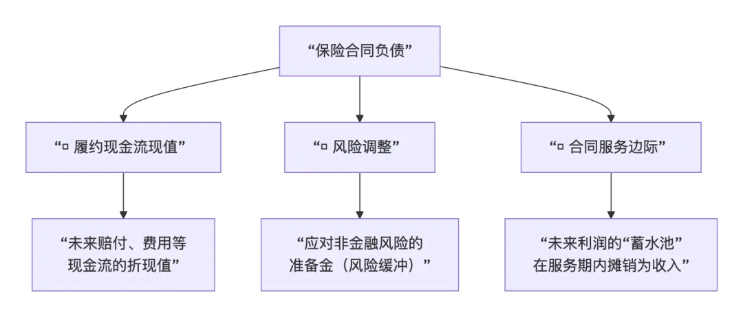 “保险合同负债 = 履约现金流现值 + 非金融风险调整 + 合同服务边际