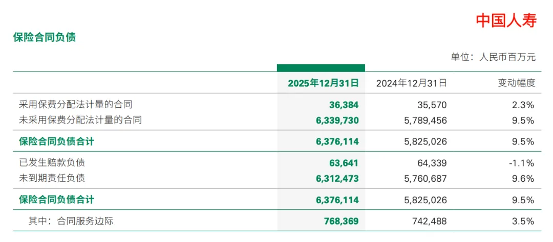 可以看到中国平安的保险合同负债为 53609.1亿(50464.89亿 + 3144.21亿),合同服务边际为 7269.01亿,而中国人寿的保险合同负债为 63761.14亿,合同服务边际为 7683.69亿。