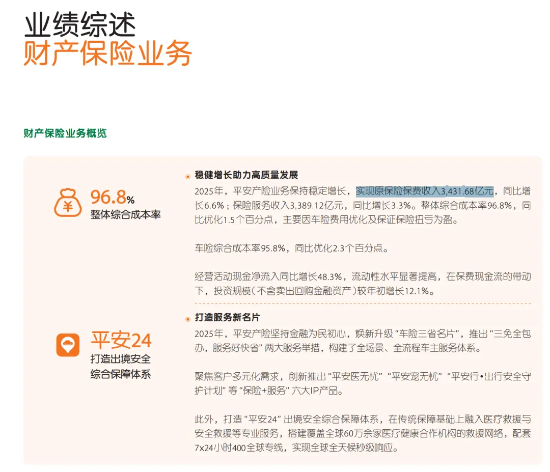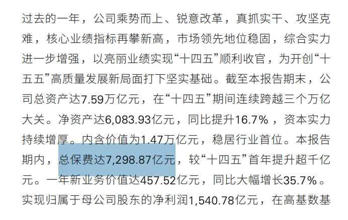 再看看中国平安,公司在开头列出了各子业务的保费收入,但是没有给出总保费收入,所以只能大致估算。