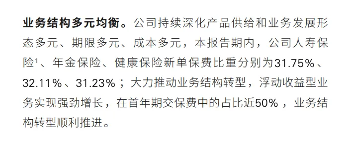 再来看看两者的业务结构,我们先看看中国人寿,公司在开头列出了总保费收入:7298.87亿元,以及各险种的占比。