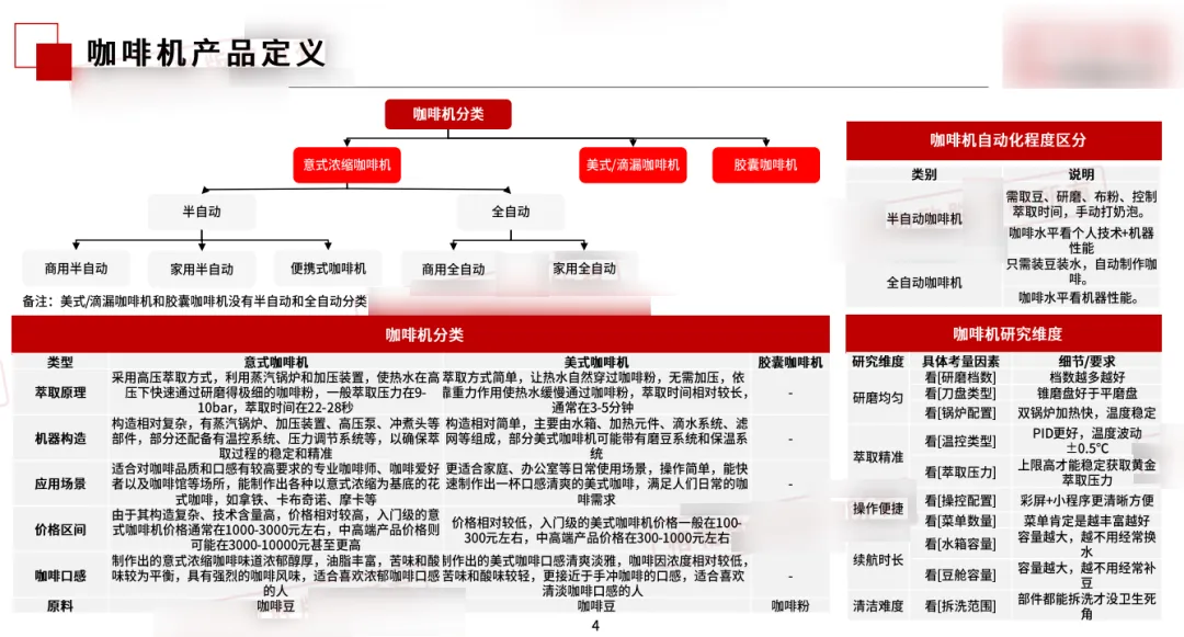 结构变化非常明确:家用市场高速增长,商用受线下业态影响放缓;意式浓缩咖啡机取代美式与胶囊机,占比近 40%;全自动机型增速远超半自动,成为大众首选。核心原因是技术国产化带来价格下探,全自动机型从 5000 + 元降至 1000—3000 元,入门门槛大幅降低。