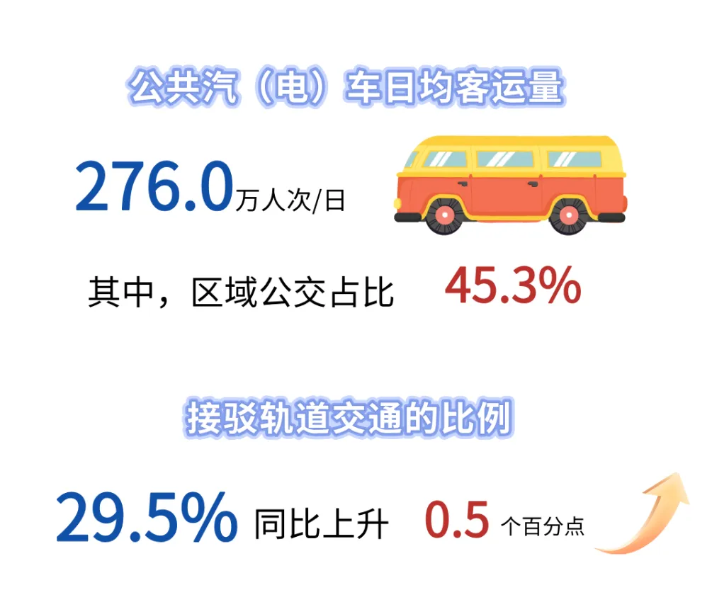 全市公共汽(电)车日均客运量276.0万人次,约29.5%的客流接驳轨道交通,同比提高0.5个百分点。区域公交线路日均客运量125.1万人次,占比45.3%,同比提高3.7个百分点。