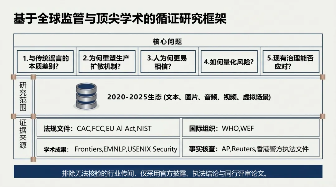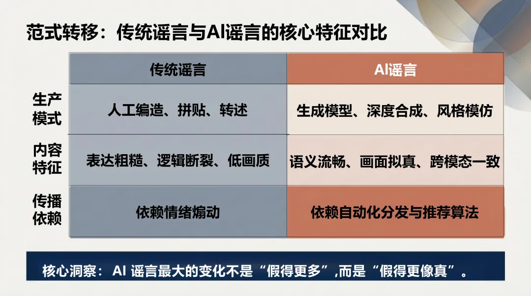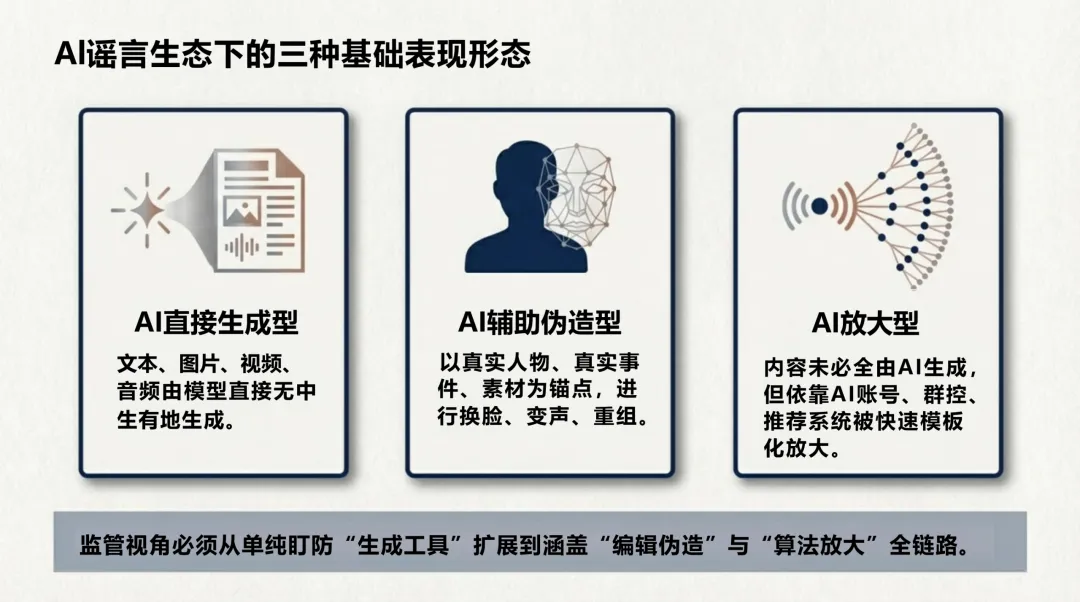 威胁范式突变:生成式AI普及重构虚假信息威胁基线,AI谣言实现分钟级生成,较传统谣言传播速度提升10-50倍,形成“生成-放大-迁移”的自动化杀伤链。 形态全面升级:分为AI直接生成、辅助伪造、算法放大三类,内容语义流畅、拟真度极高,彻底打破“人工编造、表达粗糙”的传统谣言特征。 危害持续扩散:已从舆论误导延伸至金融波动、选举干预、企业诈骗,2024年深度伪造诈骗涉案金额超亿级,短时即可造成不可逆现实损失。