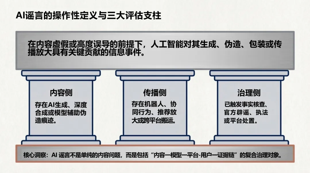 认知劫持效应:AI内容以“技术现实主义”降低人类深度思考动机,摧毁“眼见为实”信任基础,产生“说谎者红利”,真实证据反被质疑。 传播机制革新:依托平台算法推荐与社交机器人矩阵放大,跨平台迁移后切断溯源链,次生变异导致原始辟谣完全失效。 治理结构性失衡:存在治理时差、规制对象错位,传统末端删帖辟谣无法应对分钟级生成的系统性风险,需向前端识别拦截转移。
