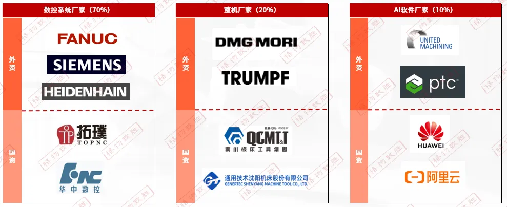 机床AI市场由数控系统厂商、机床整机厂商、AI软件厂商三部分玩家参与。德日品牌占据主导地位,国产品牌加速追赶。