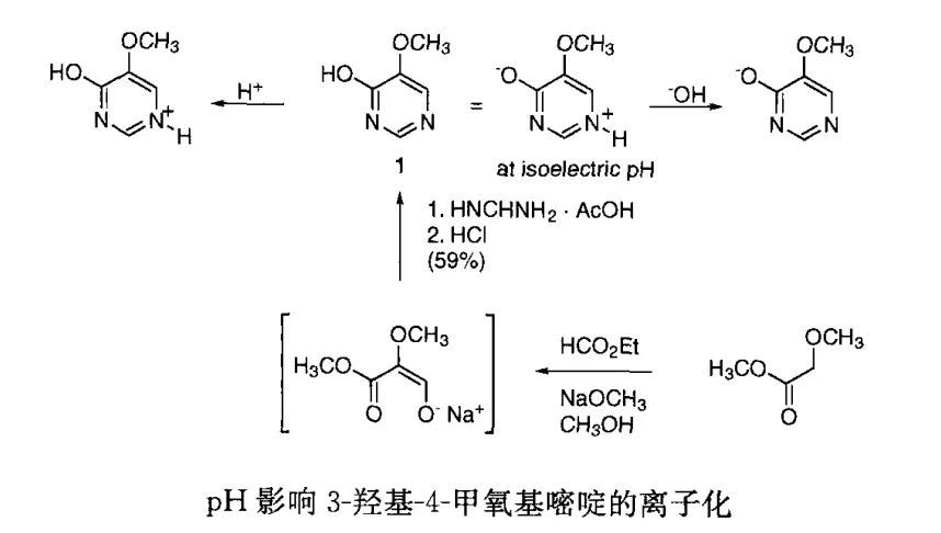 在中试车间或者生产设备中,为了精细控制工艺过程,可以进行监控。点式条件的工艺如果被采用,必须加以控制。例如,在pH大于或小于5.3的条件下重结晶,3-羟基-4-甲氧基嘧啶的收率会急剧降低,这可能和其两性的本质有关。因此放大时严格控制分离条件,收率才会重现。