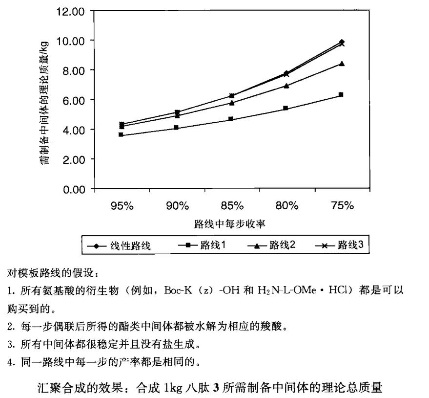 当子路线在靠近合成路线末端汇聚,所需要合成的中间体的总量明显减少。例如,单步收率75%-80%,一条线性路线需要自备比末端汇聚路线多50%(质量分数)的中间体。进一步研究发现,路线3中需要合成的中间体总量和线性路线本来是一样的。用非线性方式去实施八肽的合成,每个汇聚路线需要一个额外的步骤,这样就增加了合成的中间体的数量。因为氨基酸具有多个官能团,额外的一步是必要的。线性路线中,每个子单元不具备多重反应性,因此不需要增加选择性反应的步骤,大大地减少了所需中间体总量。