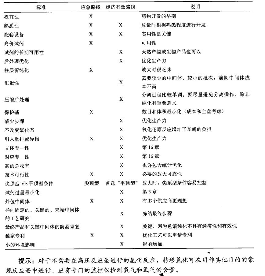 药物和精细化学品的合成路线可分为两类:应急路线和最佳路线。应急路线用于药物筛选的前期,以便及时制备初期试验中所需的原料,是迅速评估所研发化合物可行性的必要条件。通常,最初用于制备克级原料的路线只经过最少的研发步骤,就直接用于放大。为了在最终期限前制备出预期的足量候选药物,可能会采用色谱纯化和其他高劳动强度的方法。使用应急路线来制备大量产品是很困难的,这样的路线很少被最终的生产工艺采纳。