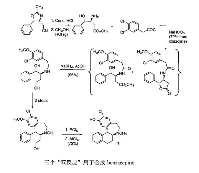 为了减少操作的次数,最好是能够重新设计一条路线,用不同的其实原料经过更少步骤得到产品。另一种方法是能够一步反应进行多个合成转化。例如,三个“双反应”用于合成benzazeine7:腈和恶唑的水解、酰胺和酯/内脂的还原和环化-去甲基化。这样的“双反应”节约了大量的操作时间和放大反应的开支。