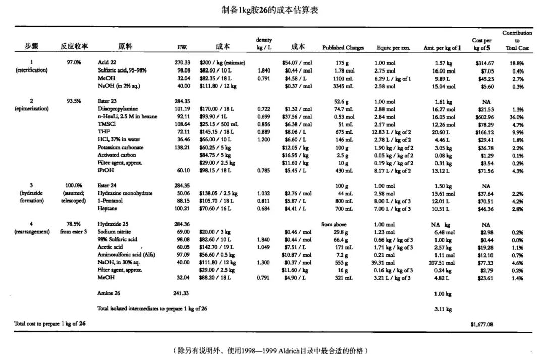一个经典的电子表格如图,其成本估算是通过Curtius重排制备1kg胺26的成本计算。中间体22的价格估算为200美元/kg,为了方便起见,其他原辅料的价格从Aldrich化学公司目录上获得。在四步合成中,得到每kg产品只需要合成分离3.11kg的中间体。分离中间体的值较低的原因是较少的步骤、其中一步反应的压缩、每步平均92%收率,以及中间体和产品相似的分子量,对于10-15步的合成,分离中间体总量和产品的期望比例是10:1,但该比例一般是15:1。