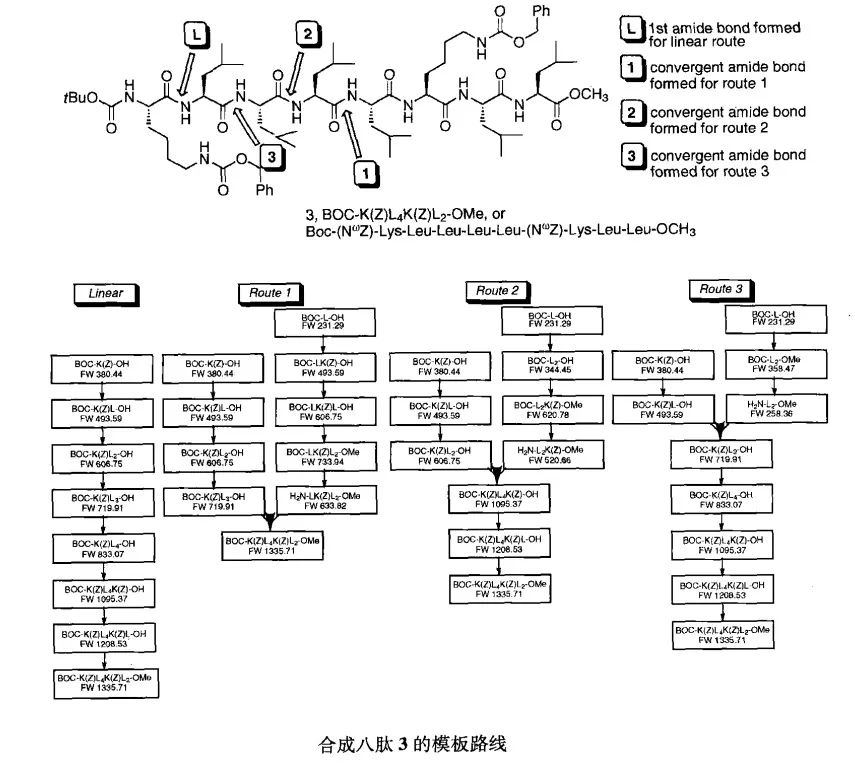 R.W.Johnson的工作者合成的八肽3有四个理论上的组装路线化合物3的合成从氨基酸单元的C端通过延展链进行,这事一个非传统的方法。如图显示