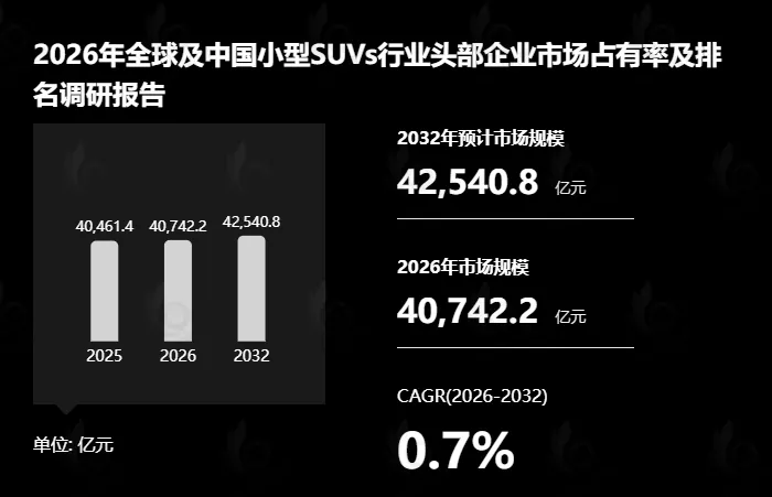 根据YH恒州诚思信息咨询调研统计,2025年全球小型SUVs市场规模约40460亿元,预计未来将持续保持平稳增长的态势,到2032年市场规模将接近42540亿元,未来六年CAGR为0.7%。