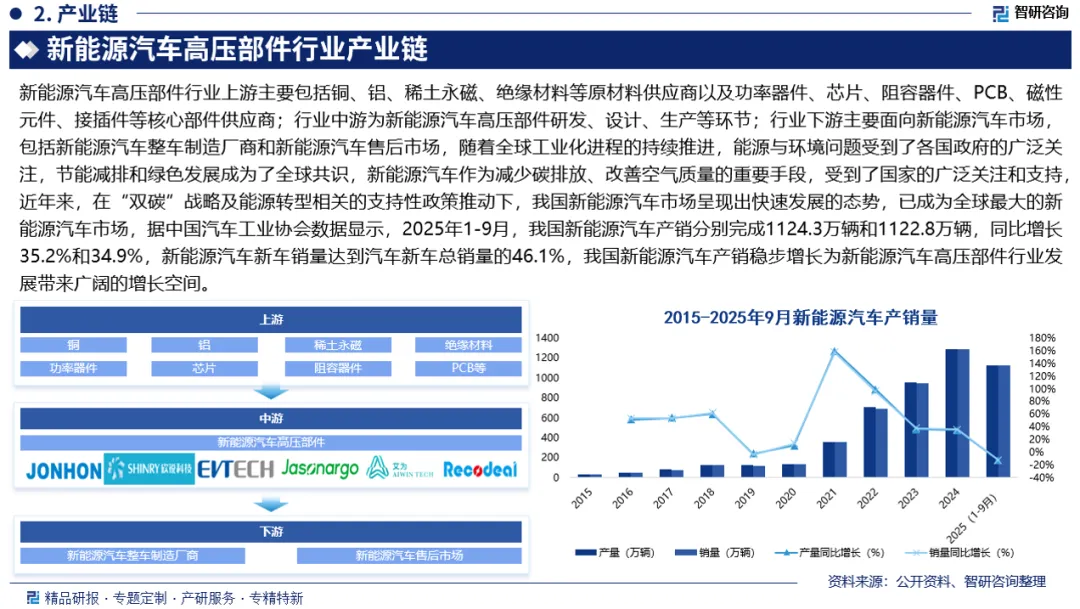 行业发展有利因素:随着全球工业化进程的持续推进,能源与环境问题受到了各国政府的广泛关注,节能减排和绿色发展成为了全球共识,新能源汽车作为减少碳排放、改善空气质量的重要手段,受到了国家的广泛关注和支持,近年来,在“双碳”战略及能源转型相关的支持性政策推动下,我国新能源汽车市场呈现出快速发展的态势,已成为全球最大的新能源汽车市场,据中国汽车工业协会数据显示,2025年1-9月,我国新能源汽车产销分别完成1124.3万辆和1122.8万辆,同比增长35.2%和34.9%,新能源汽车新车销量达到汽车新车总销量的46.1%,我国新能源汽车产销稳步增长为新能源汽车高压部件行业发展带来广阔的增长空间。