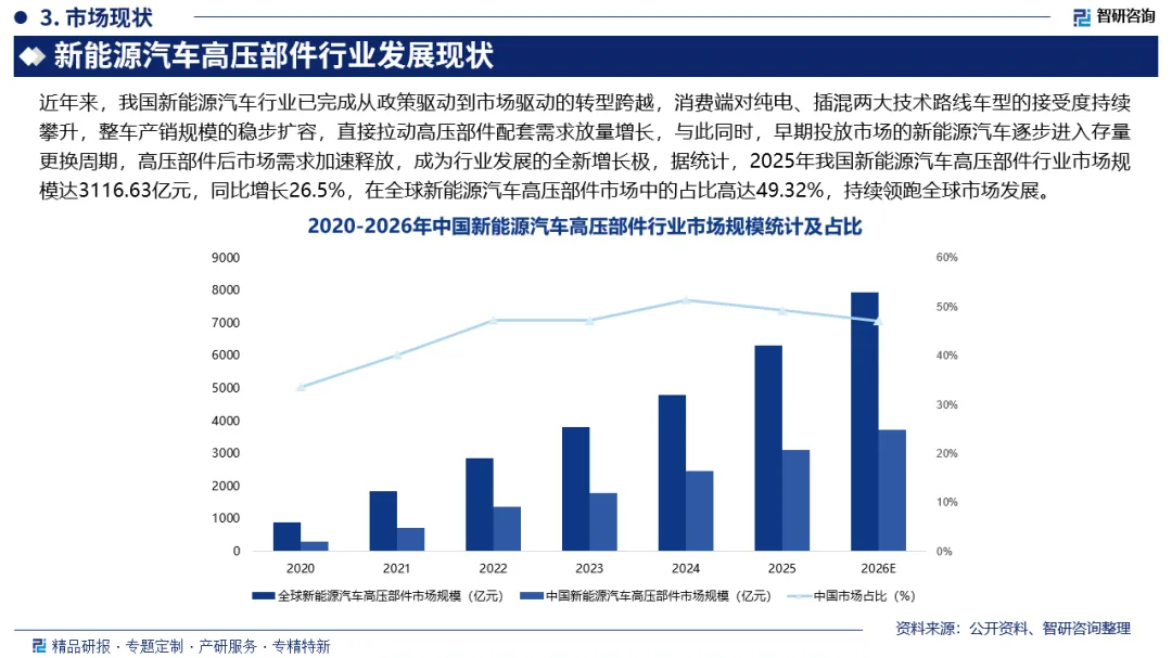 新能源汽车高压部件是指新能源汽车中工作电压高于传统低压电气系统的电气设备和组件,是构成高压系统的核心。近年来,我国新能源汽车行业已完成从政策驱动到市场驱动的转型跨越,消费端对纯电、插混两大技术路线车型的接受度持续攀升,整车产销规模的稳步扩容,直接拉动高压部件配套需求放量增长,与此同时,早期投放市场的新能源汽车逐步进入存量更换周期,高压部件后市场需求加速释放,成为行业发展的全新增长极,据统计,2025年我国新能源汽车高压部件行业市场规模达3116.63亿元,同比增长26.5%,在全球新能源汽车高压部件市场中的占比高达49.32%,持续领跑全球市场发展。