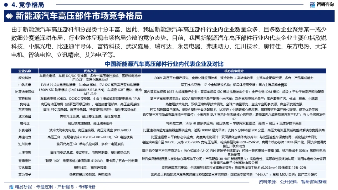 市场竞争格局:由于新能源汽车高压部件细分品类十分丰富,因此,我国新能源汽车高压部件行业内企业数量众多,且多数企业聚焦某一或少数细分赛道深耕布局,行业整体呈现市场格局分散的竞争态势。目前,我国新能源汽车高压部件行业内代表企业主要包括欣锐科技、中航光电、比亚迪半导体、富特科技、武汉嘉晨、瑞可达、永贵电器、弗迪动力、汇川技术、奥特佳、东方电热、大洋电机、智德电控、立讯精密、艾为电子等。
