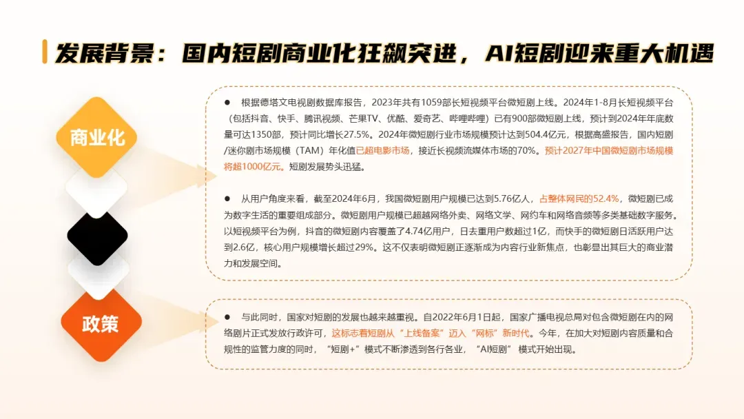 本文件深度剖析了AI短剧这一智能视听新物种,为出海企业提供了从技术创新到内容生产的全景式洞察。文件指出,随着AIGC技术加速落地,AI视频生成已在微短剧领域实现“一键成剧”的生产力跃迁,尤其在文化出海、品牌叙事和低成本内容工业化生产方面展现出巨大潜力,跨境内容创作者必须把握“技术+文化”双轮驱动的战略窗口期。