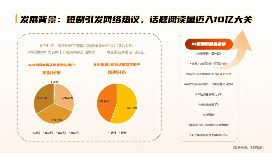 • 中国AI短剧市场规模爆发式增长:2024年微短剧市场规模预计达504.4亿元,用户规模达5.76亿,占网民总数52.4%;预计2027年将突破千亿,已接近长视频流媒体市场的70%,成为DTC品牌内容营销的新阵地。