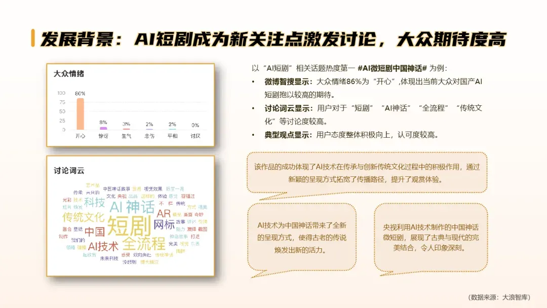 • AI短剧核心应用场景聚焦文化输出与品牌叙事:当前爆款题材集中于中国神话、历史、非遗等文化IP,借助AI实现视觉奇观与传统美学融合,形成“科技传承文化”的独特内容资产,适合用于海外社交媒体建立品牌调性与文化认同。
