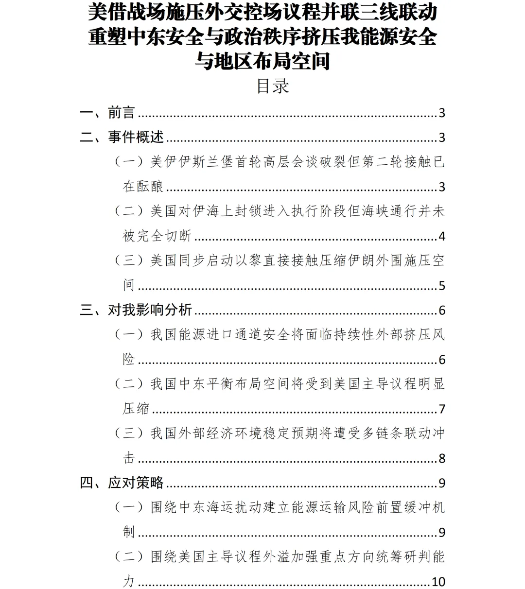 美东时间2026年2月28日,美国与以色列对伊朗发动联合打击,中东局势随即由局部军事行动迅速外溢为涉及海峡通道、核问题、地区代理力量和多边斡旋机制的复合性危机。至4月中旬,临时停火尚未稳固,美方一面推动美伊在伊斯兰堡重启高层接触,一面启动对伊朗港口及沿海地区的海上封锁,并同步在华盛顿撮合以色列与黎巴嫩举行数十年来首次直接会谈,显示其正借战场施压、外交控场和议程并联三线联动,加快重塑中东安全与政治秩序。当前事态的敏感性已不在于单场冲突本身,而在于美国正试图把核约束、能源通道控制和地区政治重组捆绑推进,外溢影响已直接压向我国能源运输安全、地区合作空间和外部经济环境稳定。