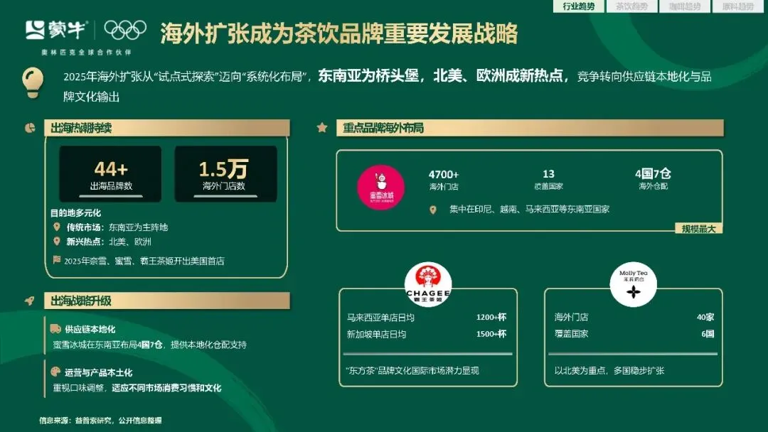 国内市场的存量竞争之外,海外成了茶饮品牌新的增长战场。2025 年,茶饮品牌的海外扩张从试点式探索,全面迈向系统化布局。目前已有超过 44 个茶饮品牌走出国门,海外门店总数达到 1.5 万家,东南亚依旧是出海的桥头堡,北美和欧洲则成了新的扩张热点。这场出海之战,早已不是简单的门店复制,竞争的核心转向了供应链本地化与品牌文化输出。海外仓配体系的搭建,产品口味的本土化调整,让东方茶饮的文化价值,在国际市场逐步打开了增长空间。
