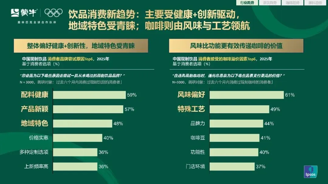 消费端的需求变化,是所有行业演变的底层逻辑。健康和创新,成了驱动消费者决策的双核心。调研数据显示,59% 的消费者会因为配料健康,尝试一款从未接触过的新品牌,57% 的消费者被产品的新颖度吸引,48% 的消费者会为地域特色买单。咖啡品类的消费逻辑则更为清晰,风味比功能更能传递产品价值,61% 的消费者愿意为偏好的风味支付更高价格,49% 的消费者看重咖啡的特殊工艺,这两个因素远超品牌力、咖啡豆产地等传统溢价因素。