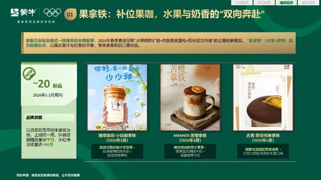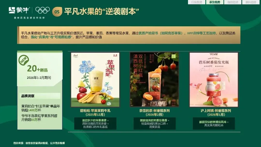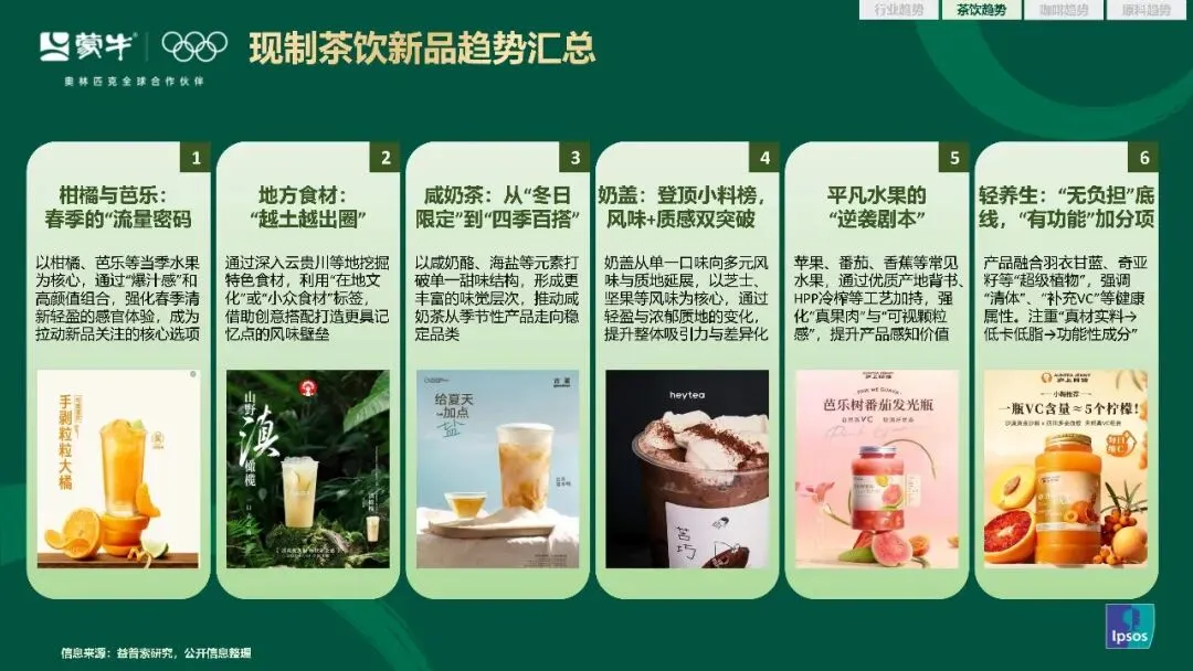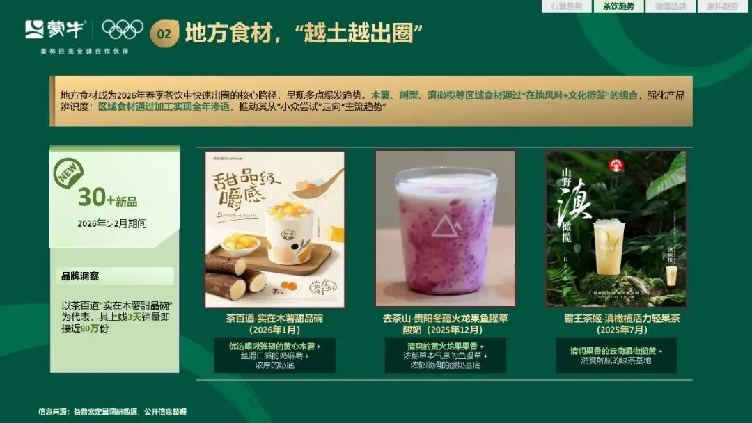 新品创新的方向也愈发清晰,咸口奶茶从冬日限定的季节性产品,走向四季适配的稳定品类。地方特色食材越土越出圈,成为品牌打造风味壁垒的核心抓手。柑橘与芭乐凭借自身的风味优势和社交属性,成为春季新品里的流量密码。奶盖从小料榜单中脱颖而出,成为茶饮风味和质感创新的重要载体。常见水果通过产地背书和工艺升级,实现了产品价值的跃迁。轻养生属性的产品持续扩容,低糖无糖的轻养生茶饮,在 2026 年春季新品中占比达到 42%,低 GI、益生菌相关产品销量同比增长 38.6%。